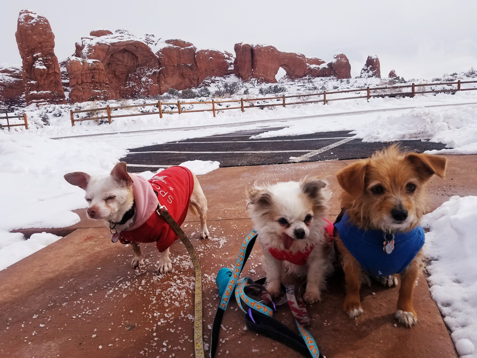 I am glad the drought is ending, but I couldn’t really hike today like I wanted to. So, the dogs and I went to Arches National Park instead. The only downside is that the dogs have to stay in the parking lots at National Parks, so I prefer dog-friendly state parks.