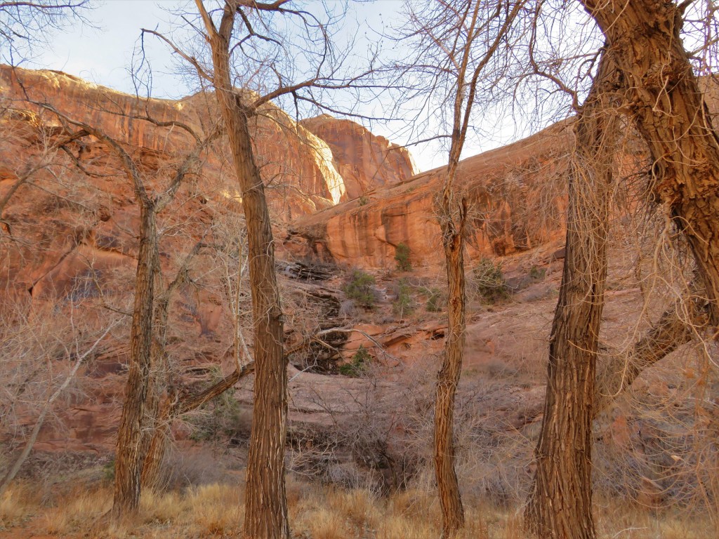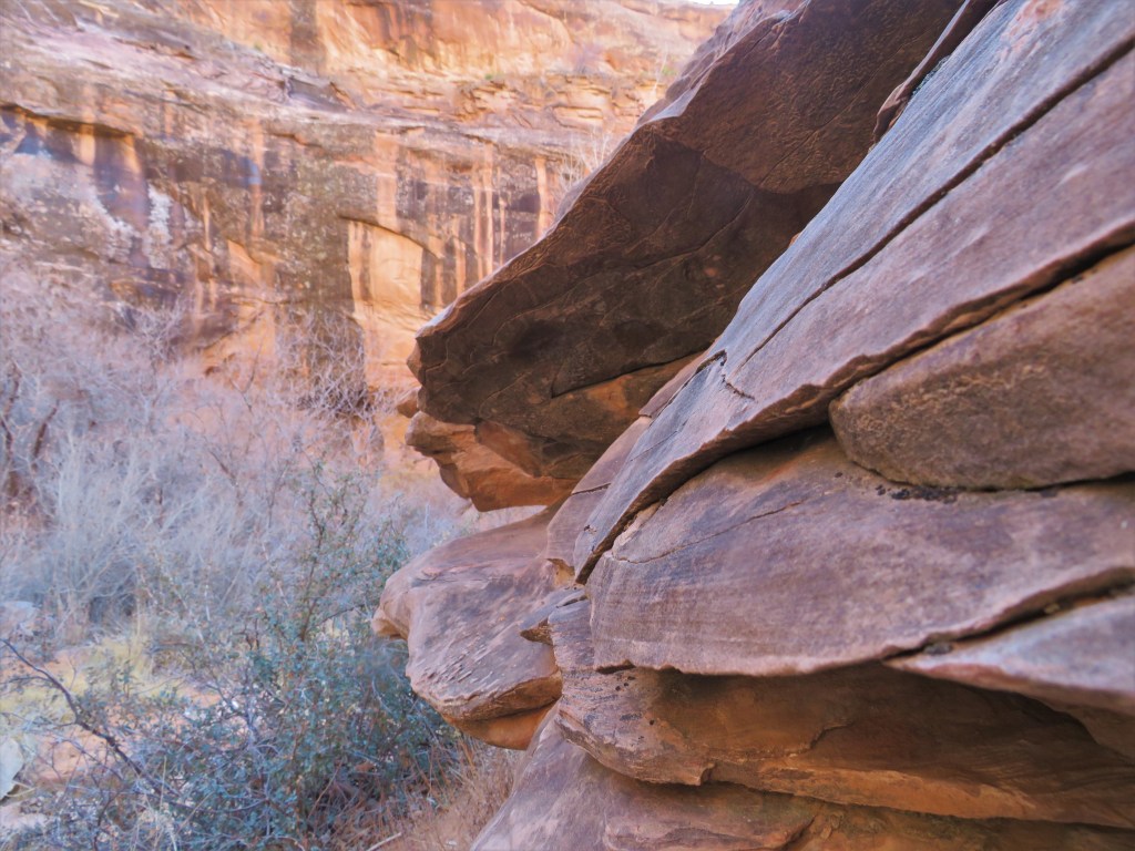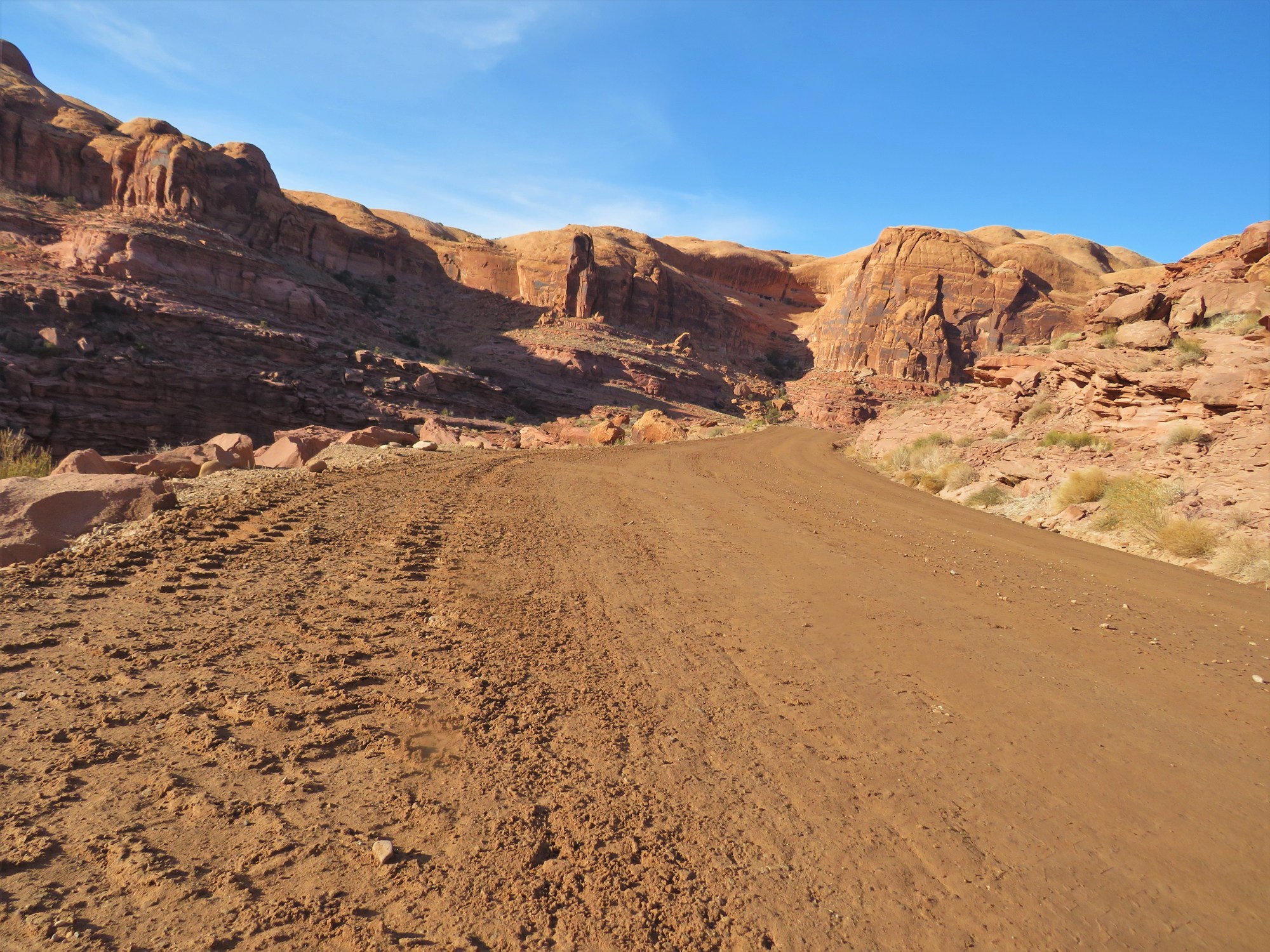 Kachina and Sazi were glad to be out of the car. Sazi has been hiking some without her wheels so I decided to pull off at another stop we saw along the way – called Moonflower Canyon. Maizzy was sacked out and the temperature was OK, so we left her in the car and took a short hike up the canyon. It was pretty flat, which is good because Sazi can’t do steps or climbing anymore because of her IVDD. It was pretty, but getting chilly, so we headed back after a mile or so. I would like to go back – it is hard to find flatter trails around Moab.