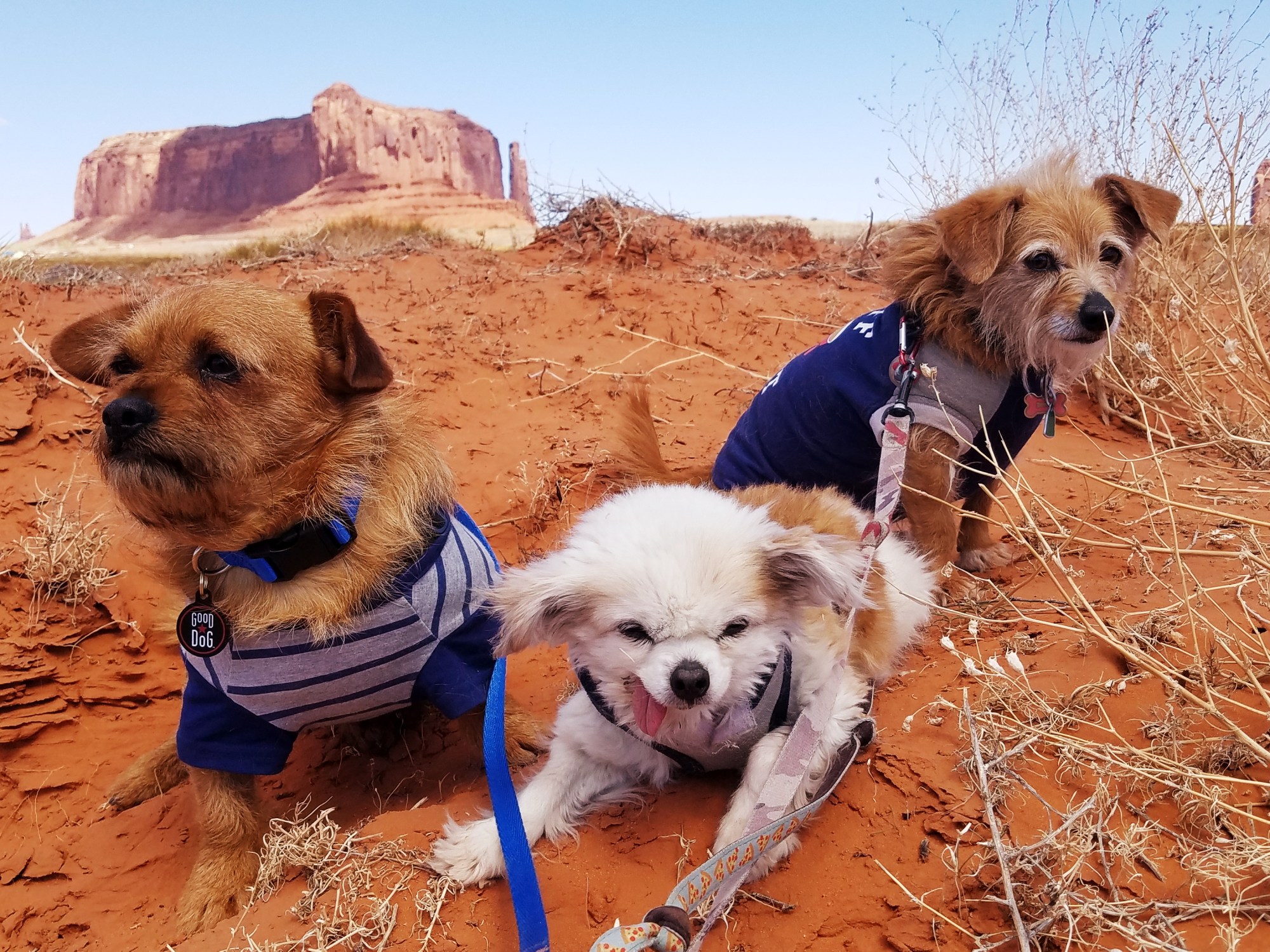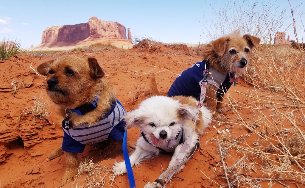 Monument Valley brings to mind a lot of movies but it is really a Navajo Tribal Park. It is also closed due to COVID. So, my photos of my dogs with the mittens in the background is out this year – but we did a roadside photo near there that came out cute enough.