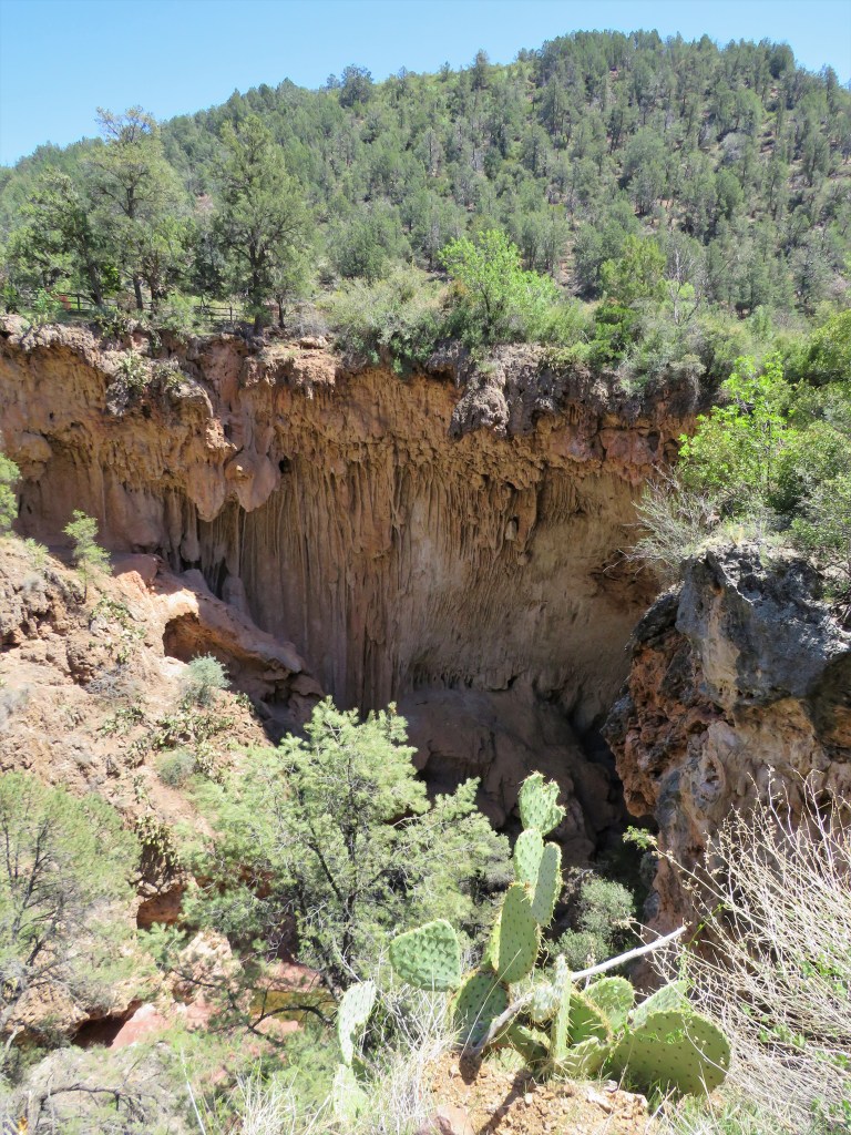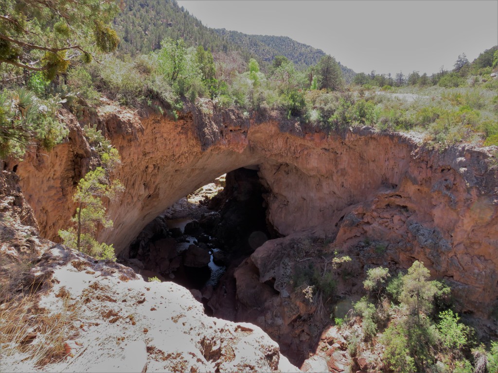 Our adventure took us south on AZ Hwy 87. We stopped and had pie for lunch in a town named Strawberry. A few miles later, we came to Tonto Natural Bridge State Park. I had seen this on the map when I planned the trip but was unsure if I wanted to stop. Our real destination was the Sonora Desert and Tonto National Monument. Both are near the Tonto National Forest – but they aren’t that close and they have very different ecosystems. The Natural Bridge is not in the Sonora Desert, but it is close to the Mogollon Rim – or drop-off from the Colorado Plateau to the low desert.
