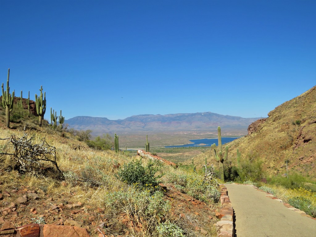 Eventually, we branched off on AZ Hwy 188 into the Tonto Basin area. I didn’t realize that Roosevelt Lake was on this road. It was a big lake in the middle of the low desert ecosystem. Kind of cool scenery. This is part of the Salt River Valley – we crossed further east on the way back up the plateau today.