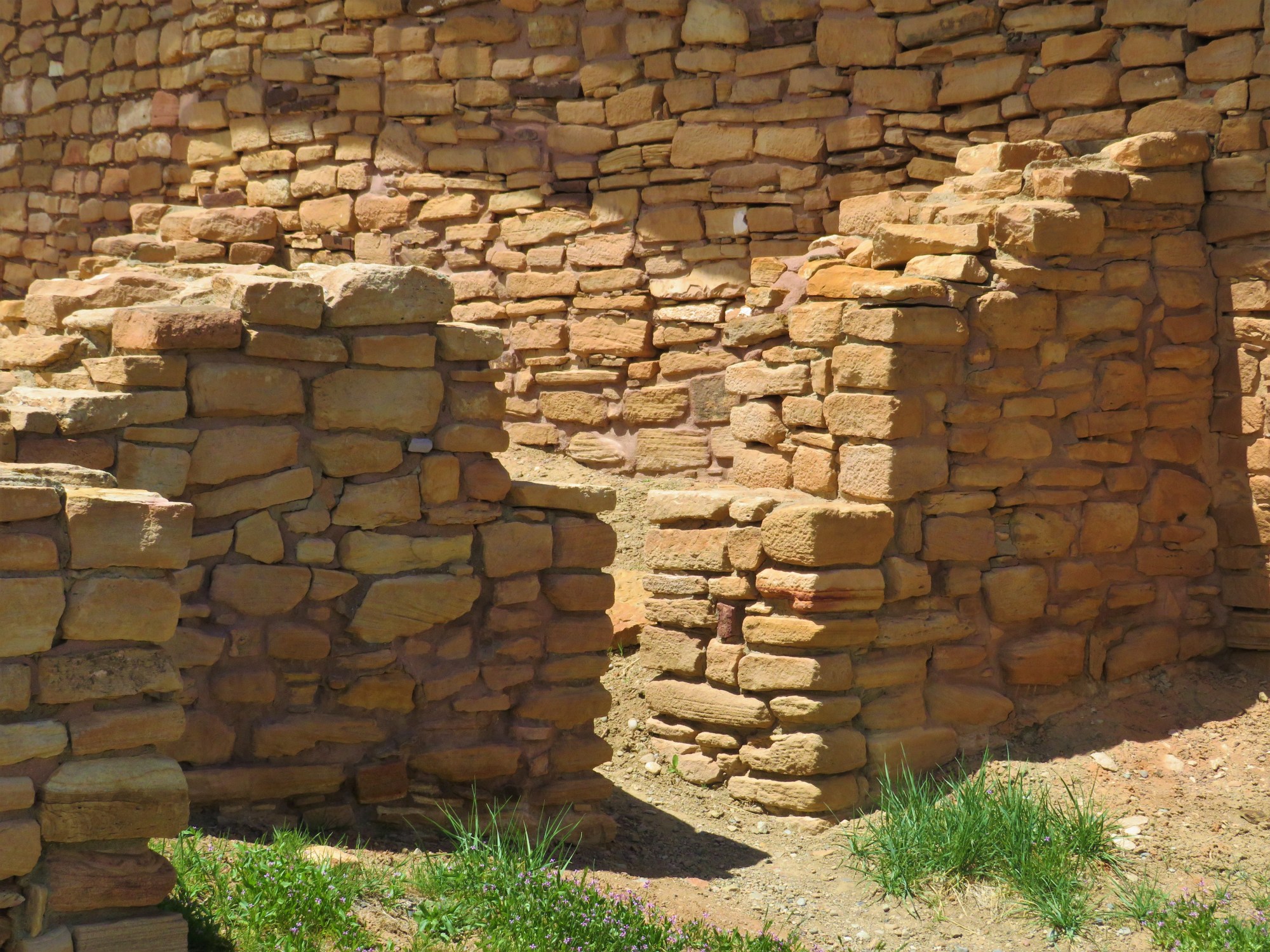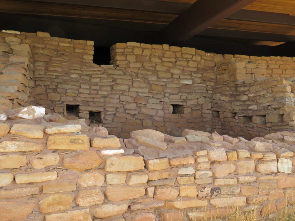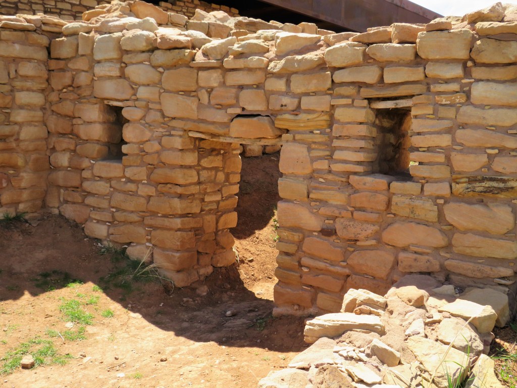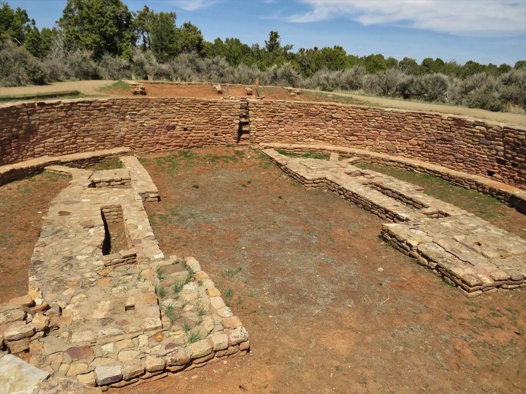 We picked up lunch somewhere near Dove Creek and took it out to Lowry Ruins for a picnic. I had banana cream pie! The dogs preferred the tacos. I like these ruins – I love the benches that look like Kokopellis. We met some people here who said they were from Montrose. Small world.