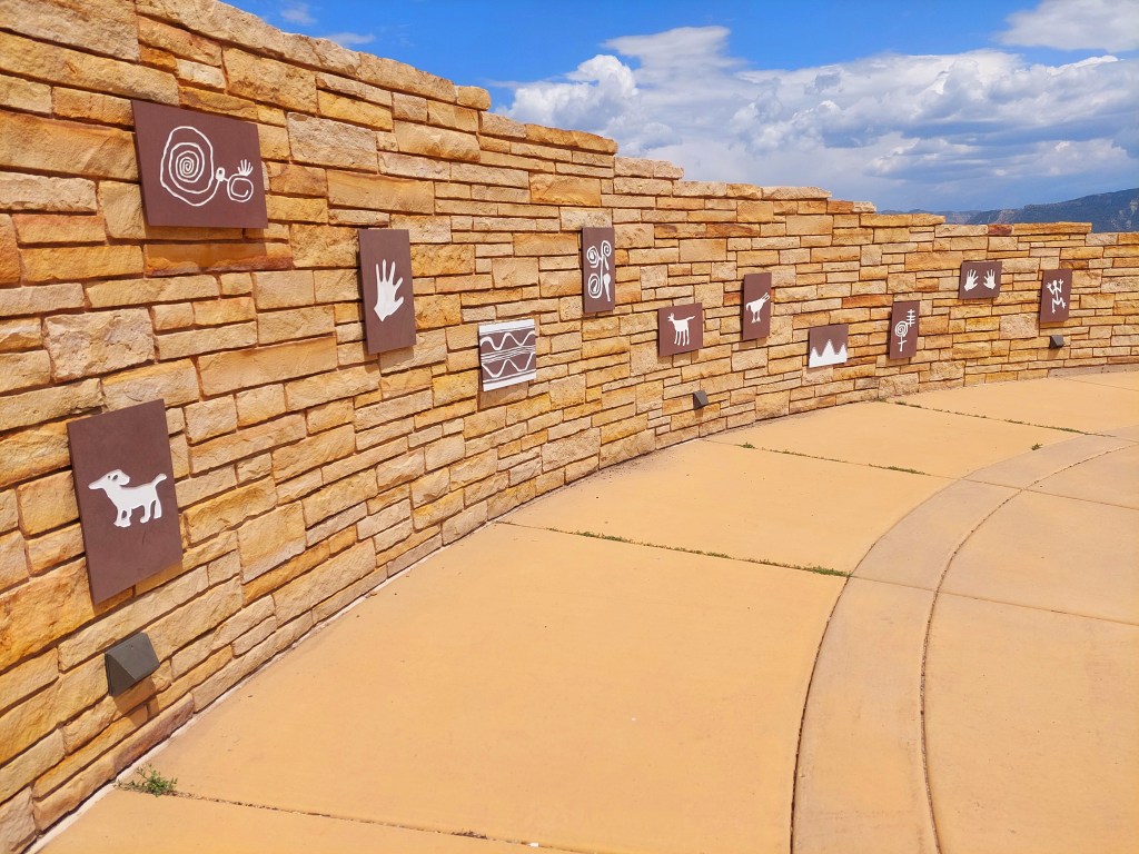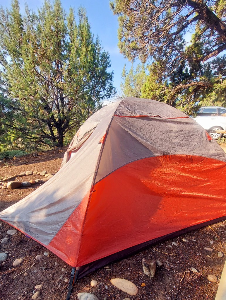 By the time we got to Mesa Verde, it was nearly 3 PM. We checked in. I had forgotten that you can find your own campsite once you get there – the bathrooms and dump stations have wifi. The first site I picked for beauty, but it got flooded during the rain that we encountered while waiting to set up the tent. So, we drove the circle for a drier spot and decided to be next to the bathroom for wifi. The only disadvantage is that I felt like our neighbors were too close and it impacted privacy and drove the dogs a little nuts.
