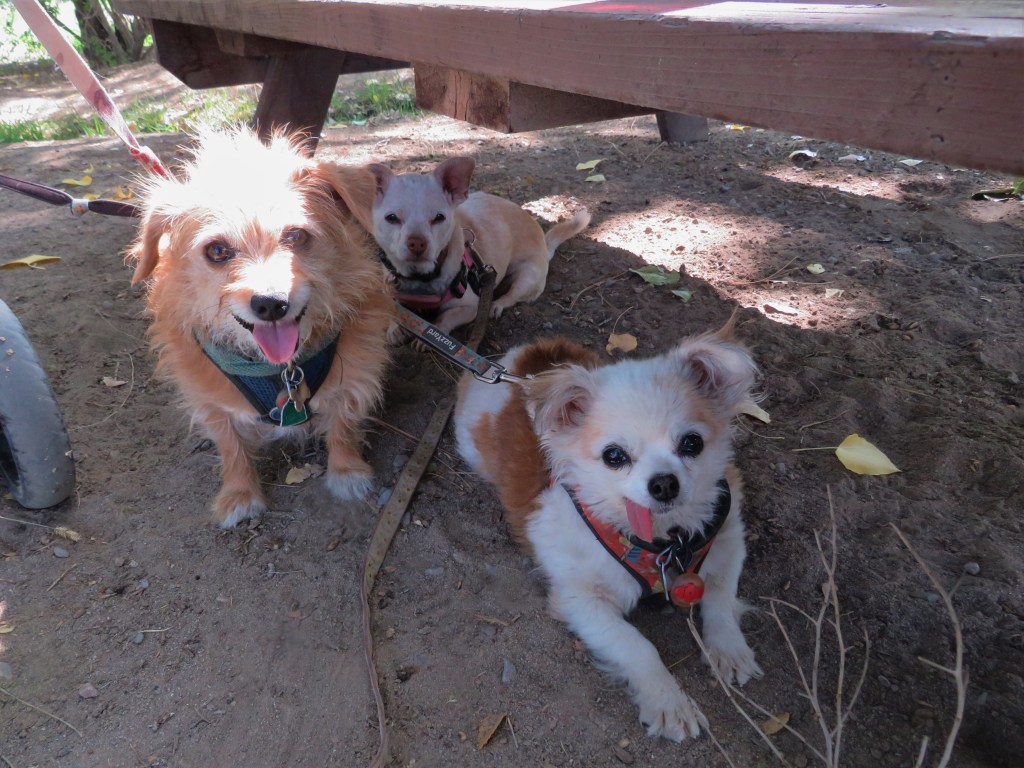 OK, back to the day – First, I sat outside in the sunshine while the tent dried. It didn’t take very long but it did delay our routine. The dogs are now use to the fact that I load the car before anyone eats, so they had to sit in the muddy earth under the table for over an hour – except Moki, who has to be tied to the fire pit or something. The gets so stuck between the table legs that I h nave not been sure how I would get him loose a couple of times, so I keep him away from the tables.