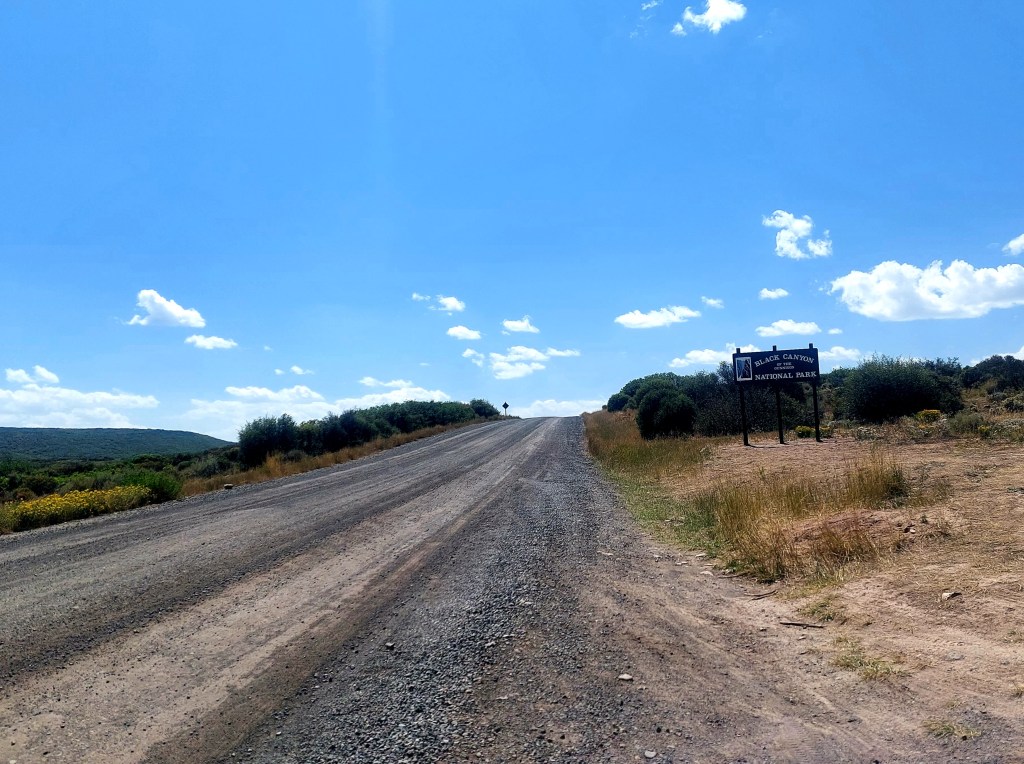 We got to the Black Canyon North Rim around 3. This is the most mellow National Park entrance in the world, I think. Just a dirt road and a sign. A few other cars off an on, but it isn’t Petrified Forest or Arches. I noticed it was clear, the sky was blue with clouds and I wondered where all the smoke from yesterday went.
