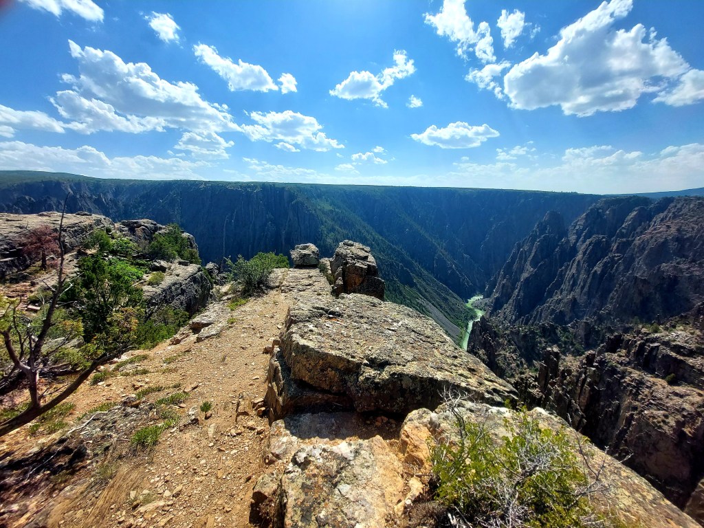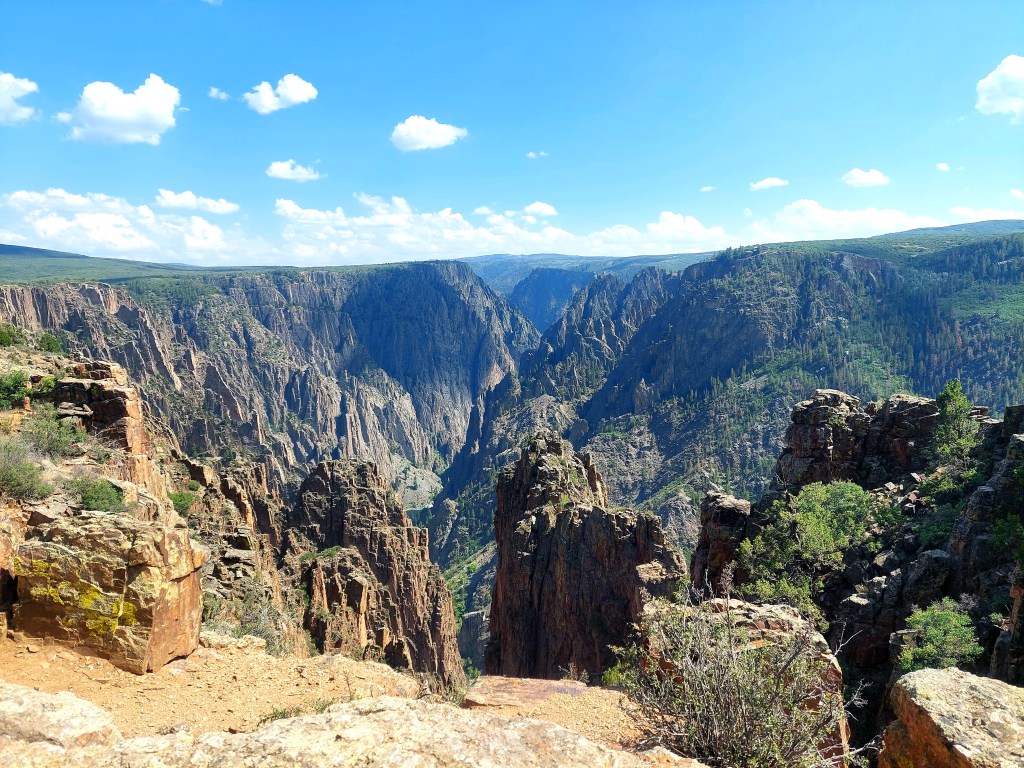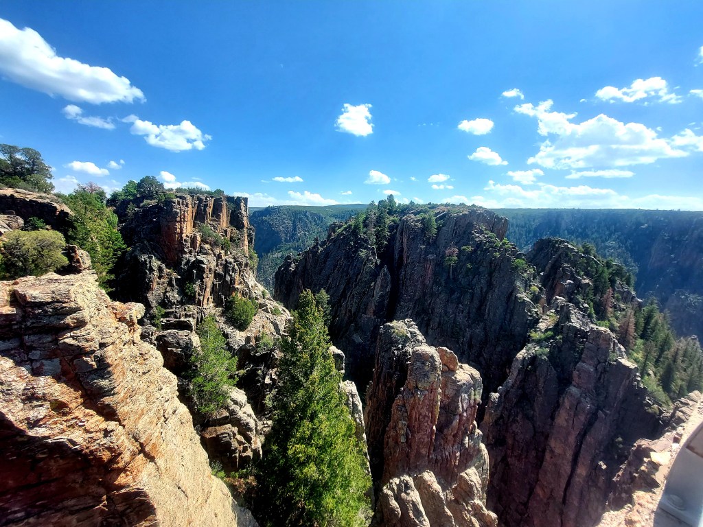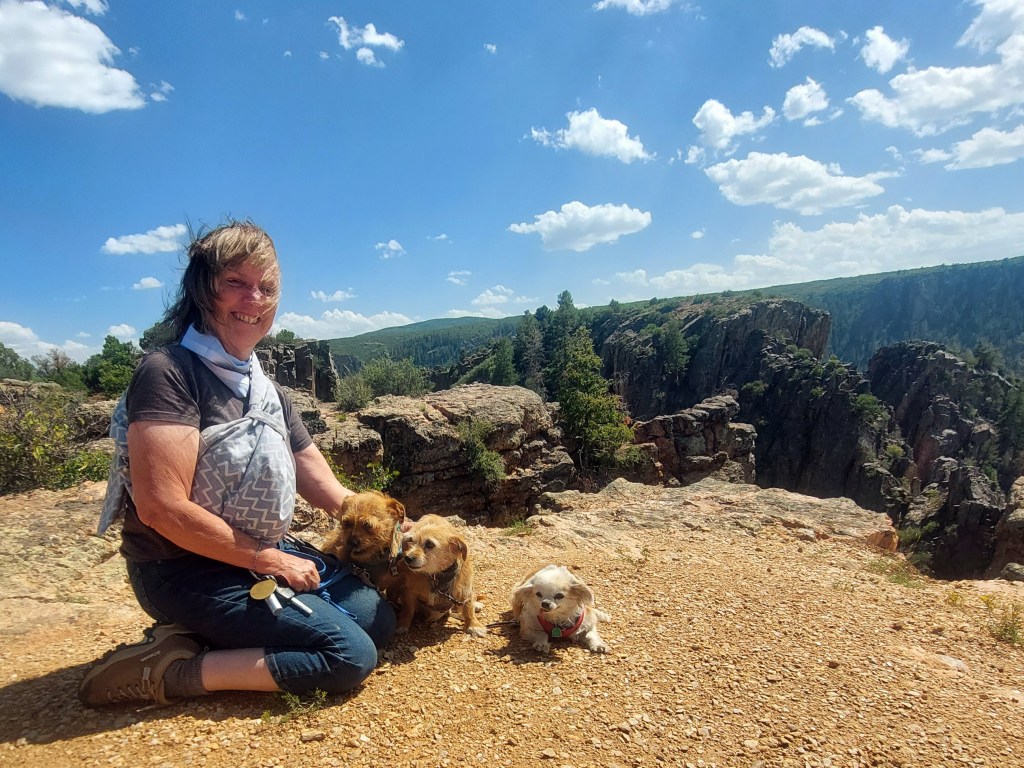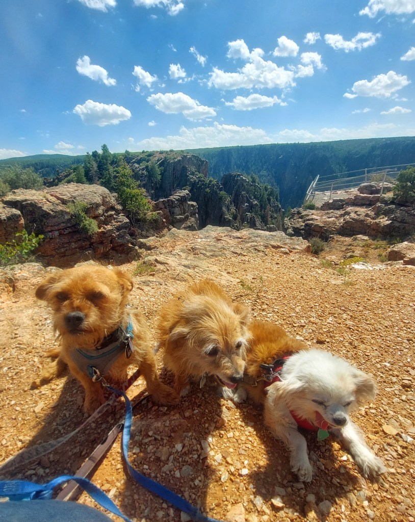 The Black Canyon is interesting geology. Nothing else on earth quite like it – harder than cement (I got a stress fracture hiking on it a decade ago). The canyon is deep and not always relaxing with my fear of heights. Still, I love the beauty enough to endure the fear. It was nice little hikes for my dogs – just the right length with the heat and wind.