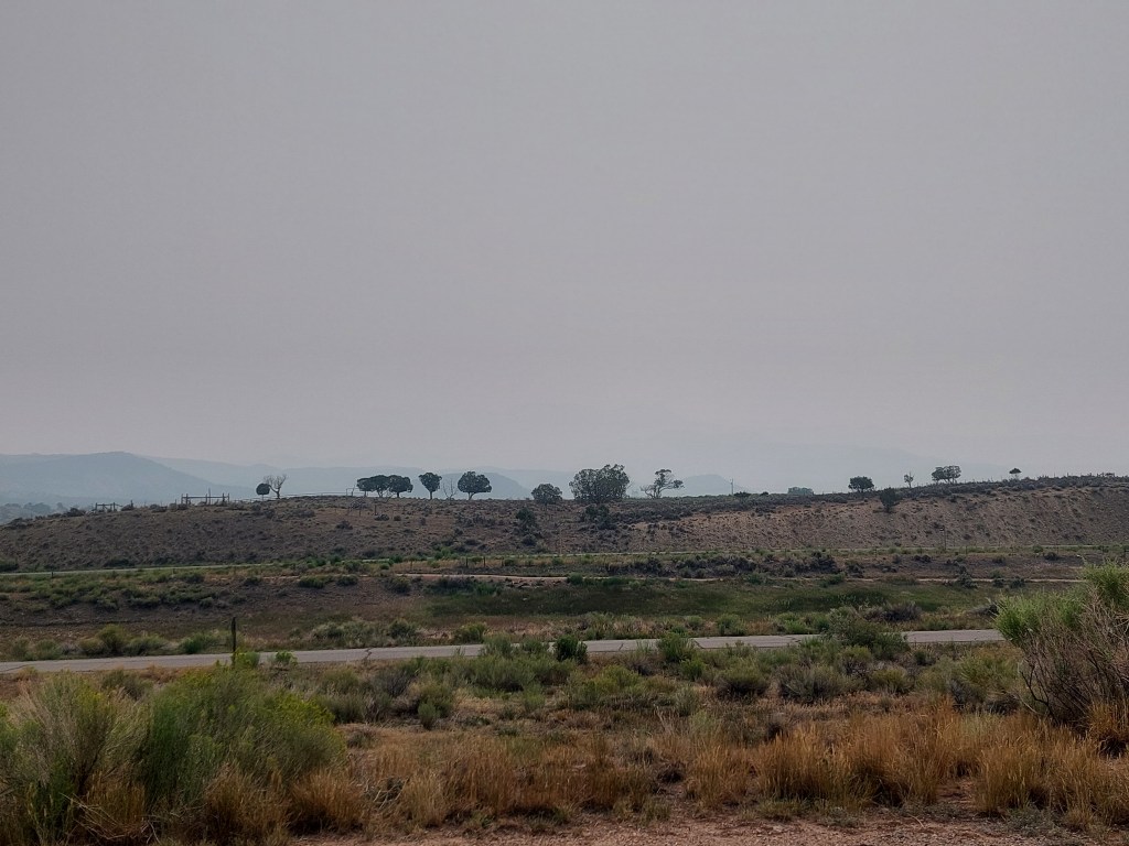 I slept late (for a tent) and it still felt cool. I looked out and I thought at first it might be rain clouds because the sky was dark grey. But, then reality sunk in that it was smoke. Below is a before and after photo (one of sunset last night in the wind, one this AM with no wind). Find the trees – this is the same photo. It felt depressing – like Armegedon or something. We were going to eat on the porch in Hotchkiss, but I decided just to go home and get out of the smoke.