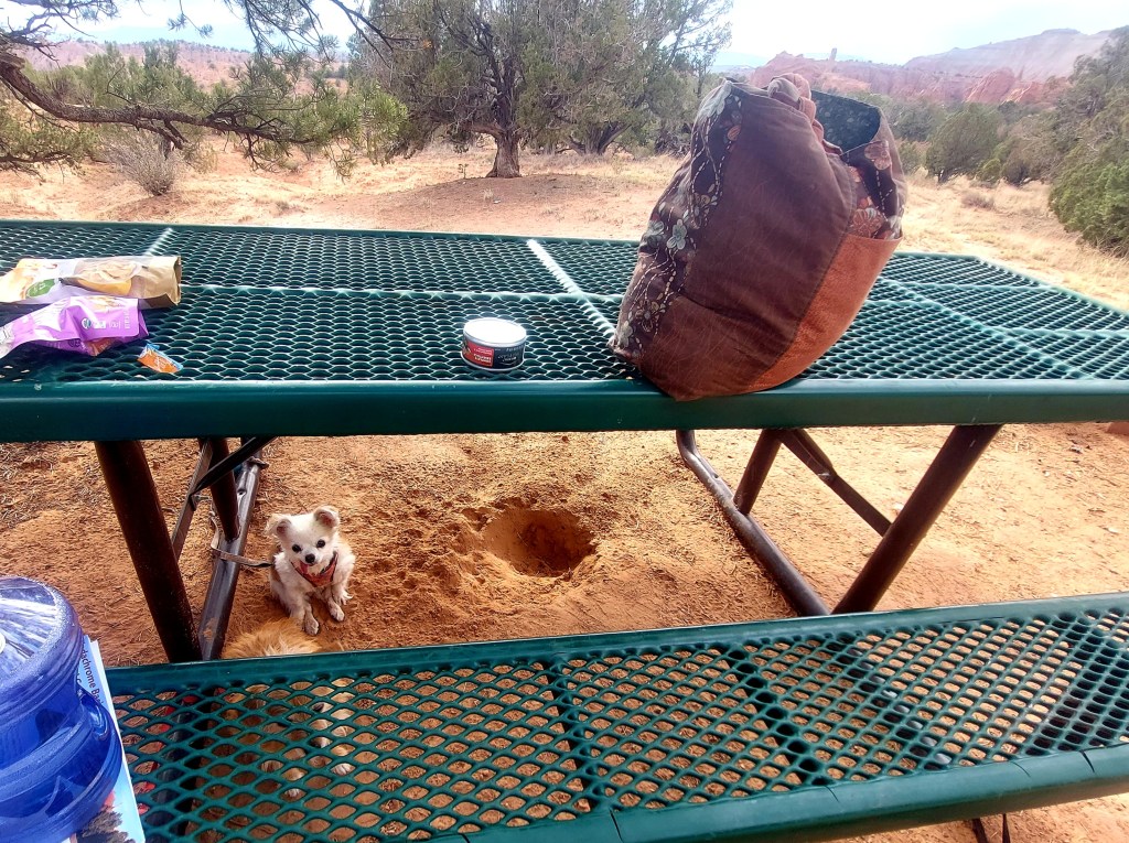 I remember feeling fatigued and my eyes were burning by the last leg of our journey into Kodachrome Basin, which is pretty rural and off the main road a bit. We had dodged the monsoons all day and it looked like we would get rain that evening at camp, but I don’t remember getting much if any. However, the sky was threatening enough that we just chilled at our site that evening. Moki dug a huge hole while I was pitching the tent that I had to fix. Sigh. Let’s get some rest before tomorrow.