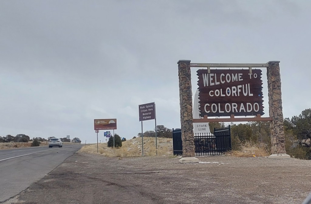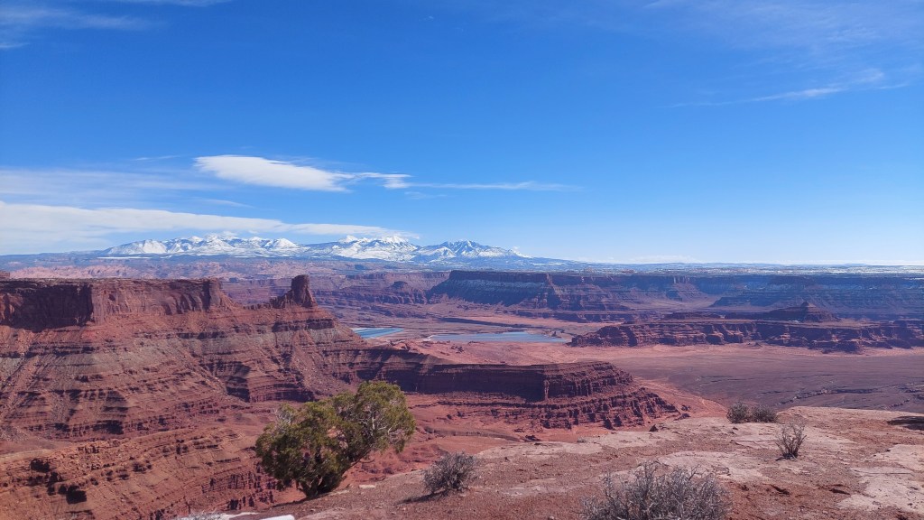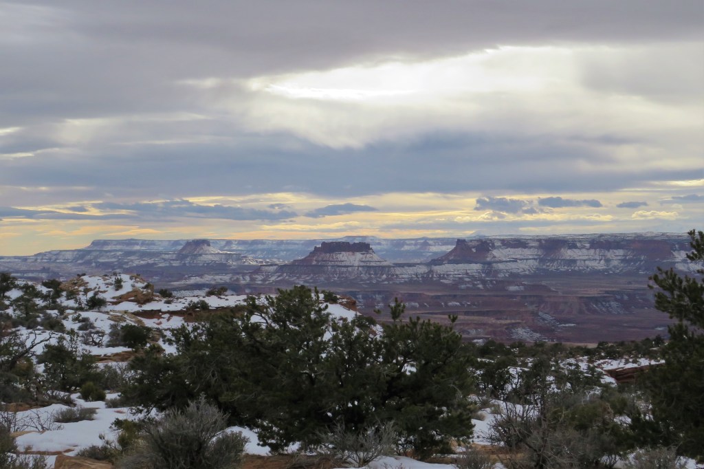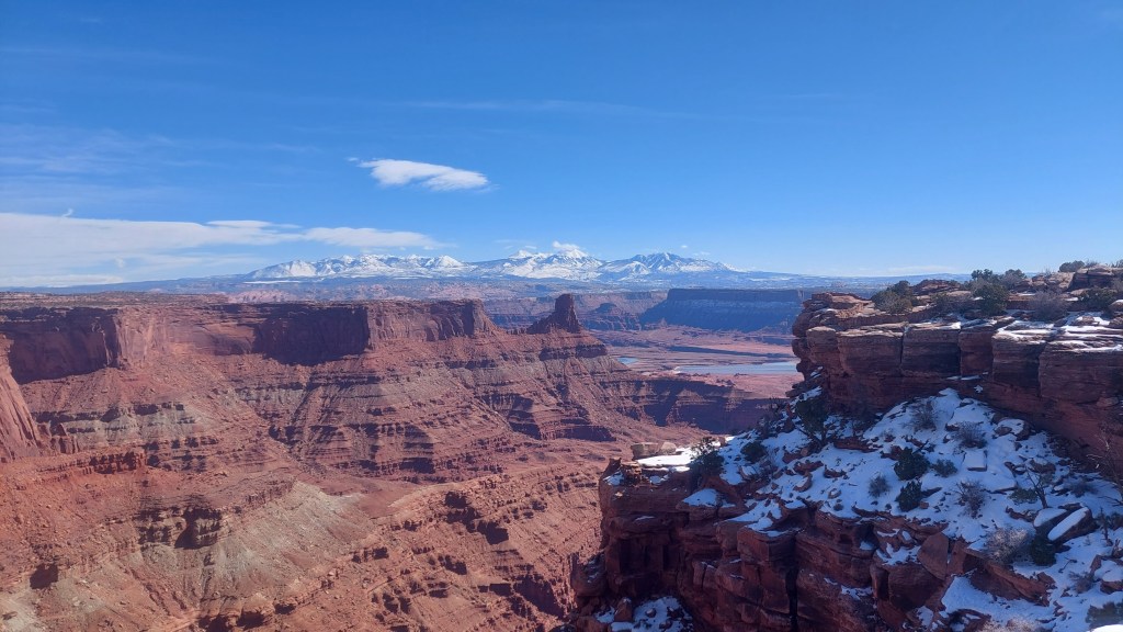 This was my birthday and my favorite day of the trip. Another winter storm was coming – which was unbelievable because Montrose had gotten nearly 2 feet the week before. But, the morning was sunny and warm. We hiked to the point at Dead Horse. It was muddy but doable. Sazi rode safely in her flat-bottom carrier and seemed to enjoy it. In fact, I remember the wind picking up on the point, so as we walked back it was blowing in our faces. I pulled my coat around to shield her face – but as soon as the wind stopped, she pushed my hand to the side so she could see everything.