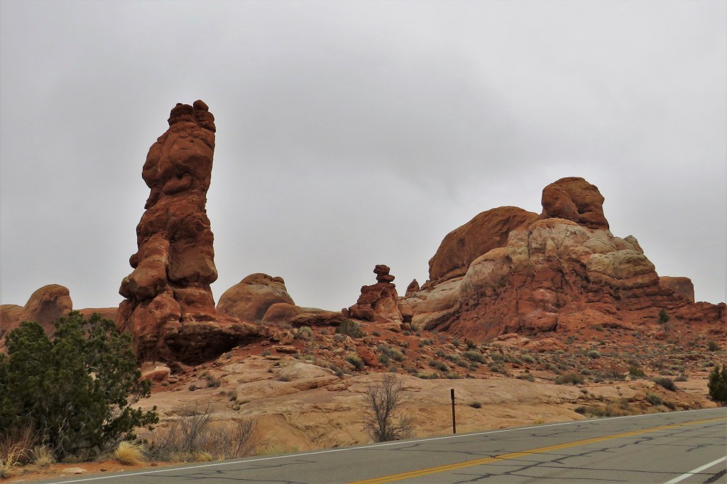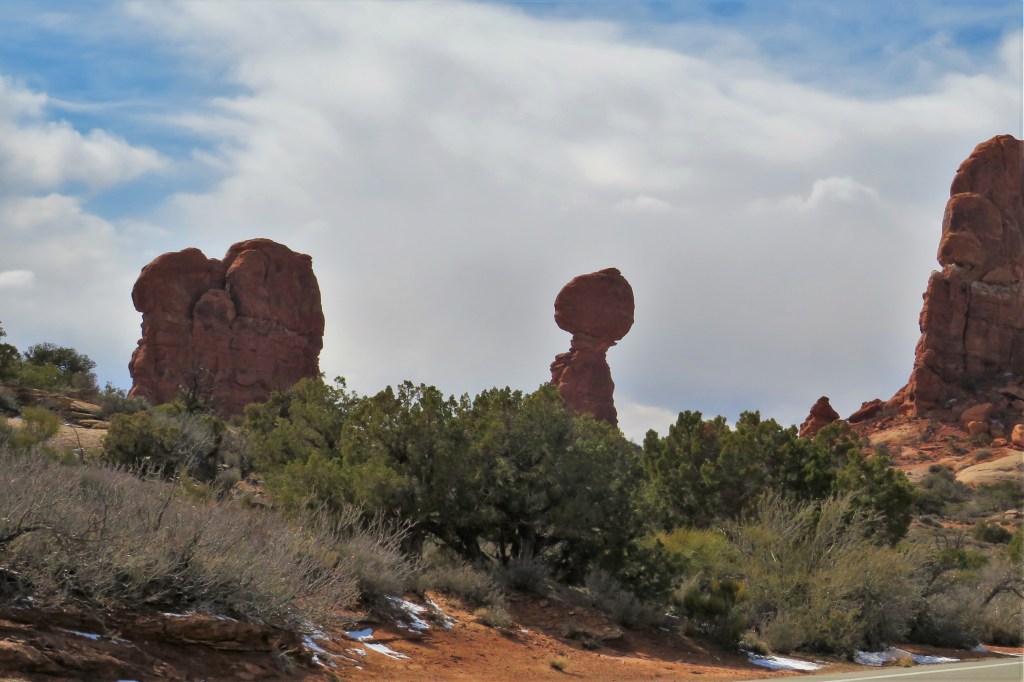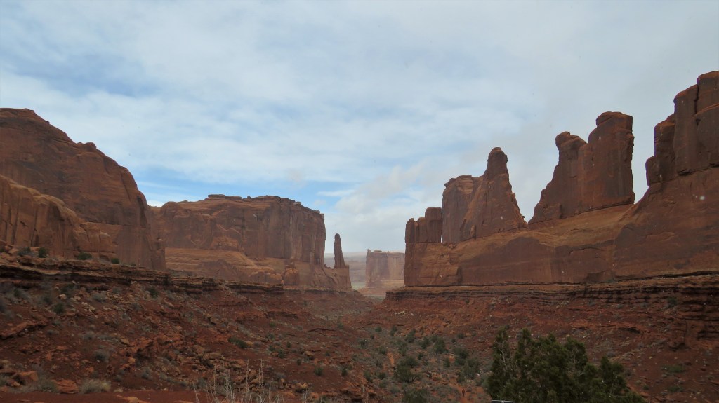We hung out at the hotel for a long time that morning. It was nice just to snuggle with the storm outside. However, by afternoon, the snow let up a little so we drove through Arches. It was pretty, but subdued. The La Sals were hidden completely by the storm and we hit some squalls. Sazi slept comfortably in her chair. I was tired of winter.
