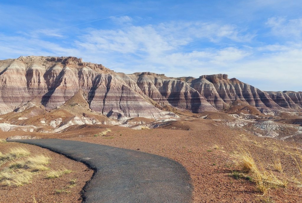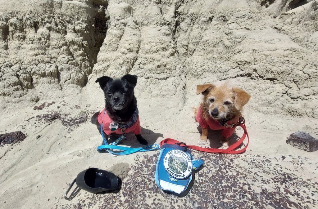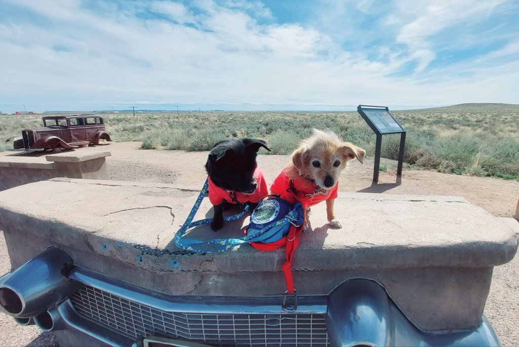 After that, it was pedal to the metal for 170 miles to our favorite dog friendly National Park. Stopped for our annual Route 66 turnout photo. I was afraid the girls would jump – last year, Sazi had asthma from the wind and Kachina hurt her leg jumping from this and limped for several days. So, not the best shot. Then, I thought we would do another short hike, but it occurs to me it’s only breezy today. About 50% of our trips here come with a full blown windstorm – 50+ MPH gusts and all. So, I decided we should do our favorite hike today – Blue Mesa. We will be back through this trip but no telling on the wind.