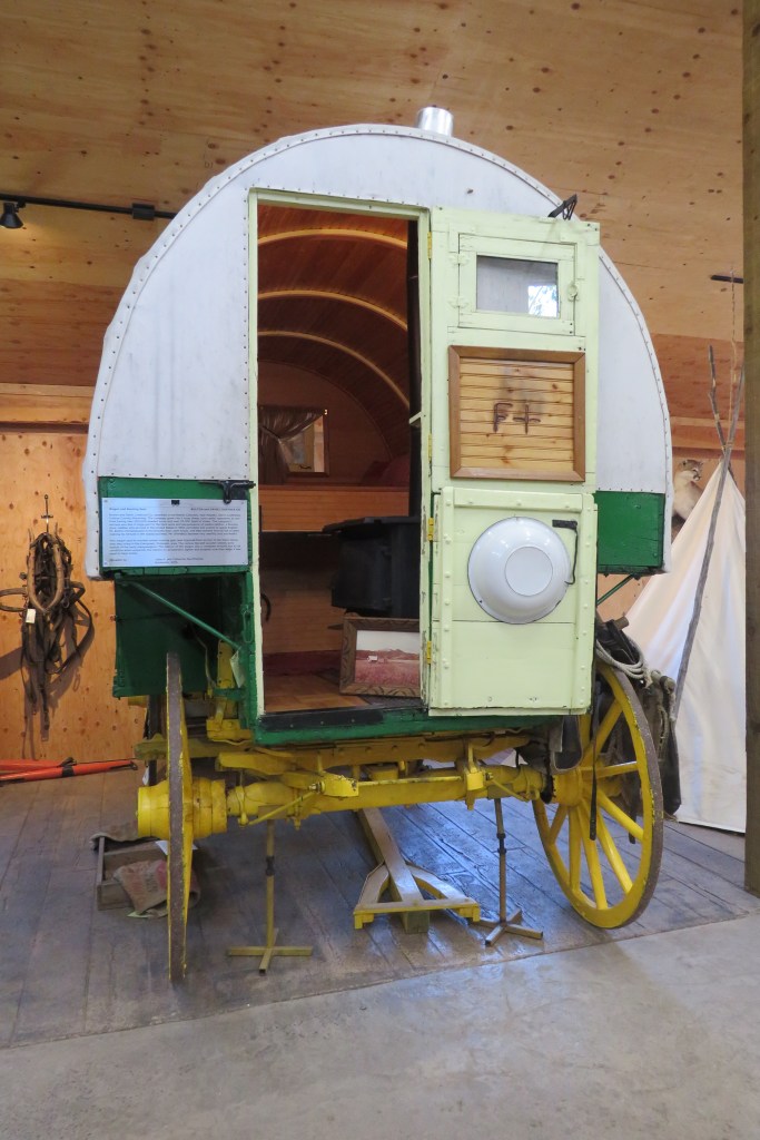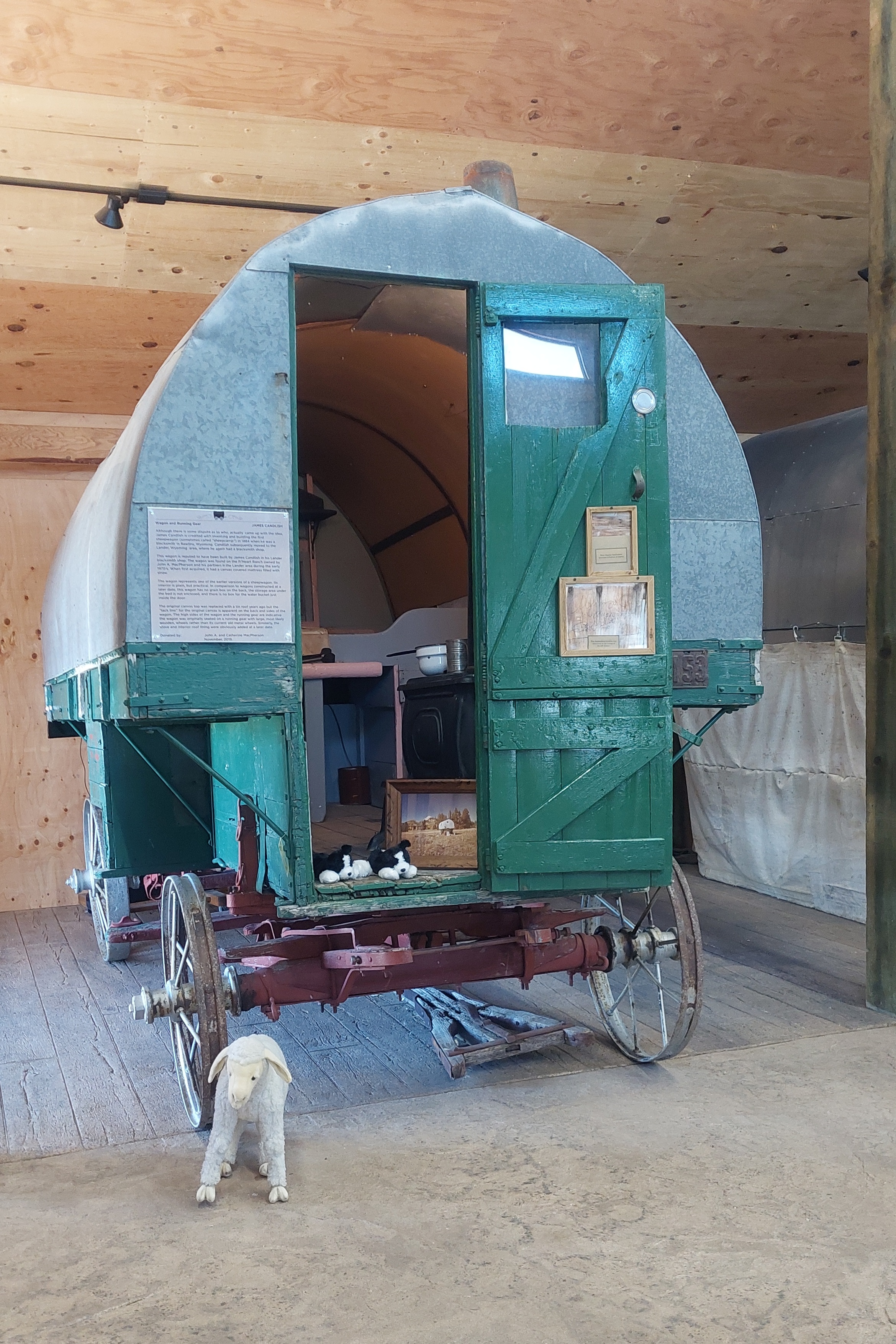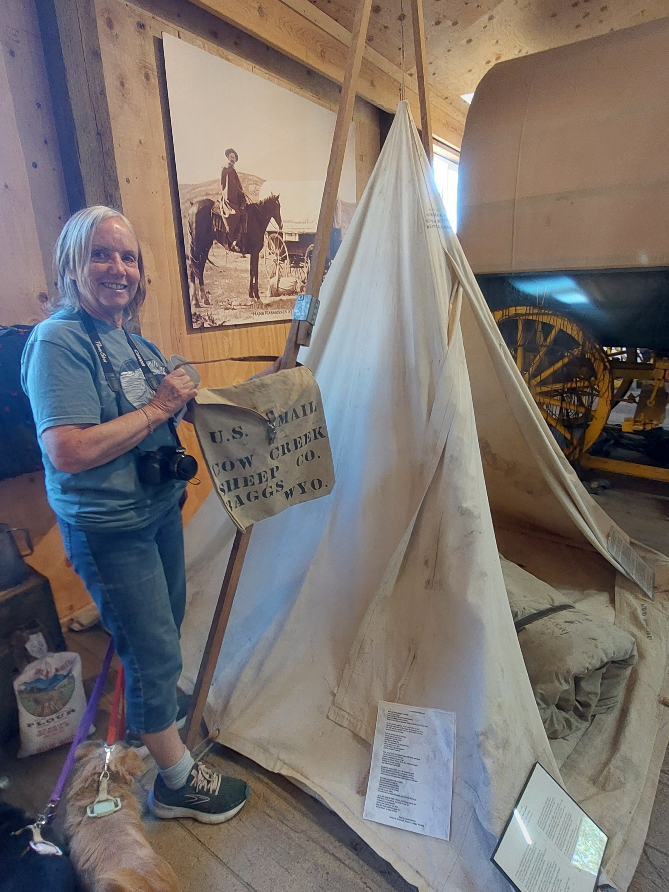 We got to the museum and Lela gave me a grand tour of the place while the dogs waited peacefully (or not) in the shade. I saw a lot of stuff that related to my grandfather’s sheep businesses. I thought my tent was small until I saw that teepee that Granddad’s sheepmen slept in! The range war era has always been interesting to me – I wish I could ask my granddad what it was like. There was a lot of information on it here and I love the old sheep wagons!