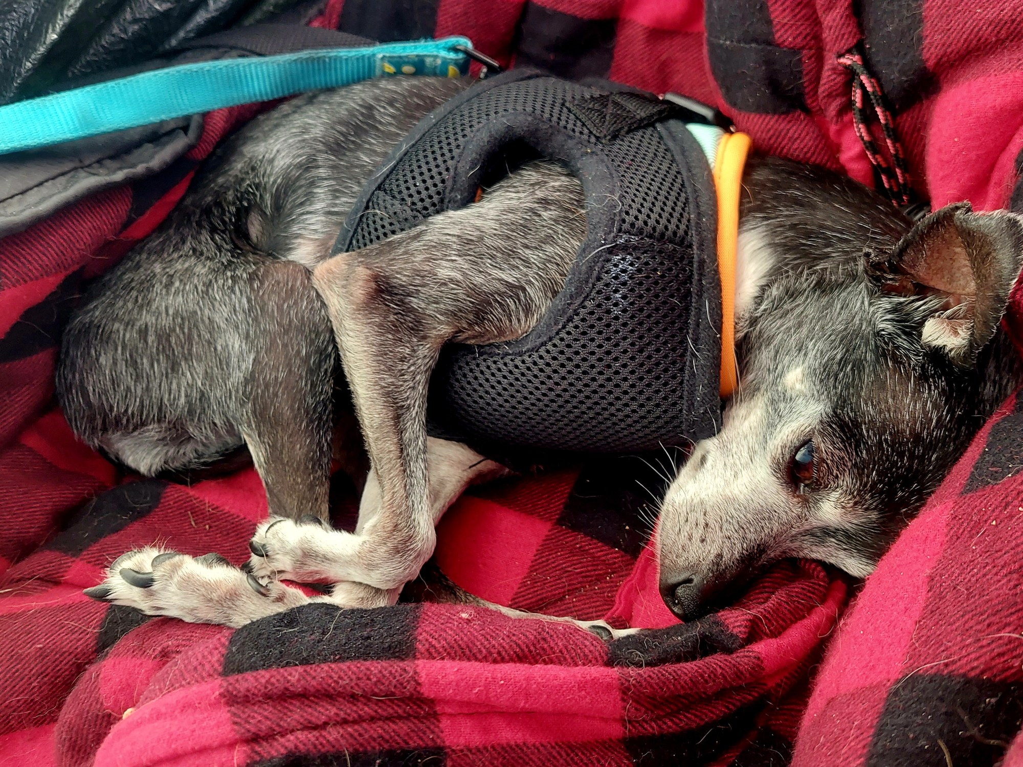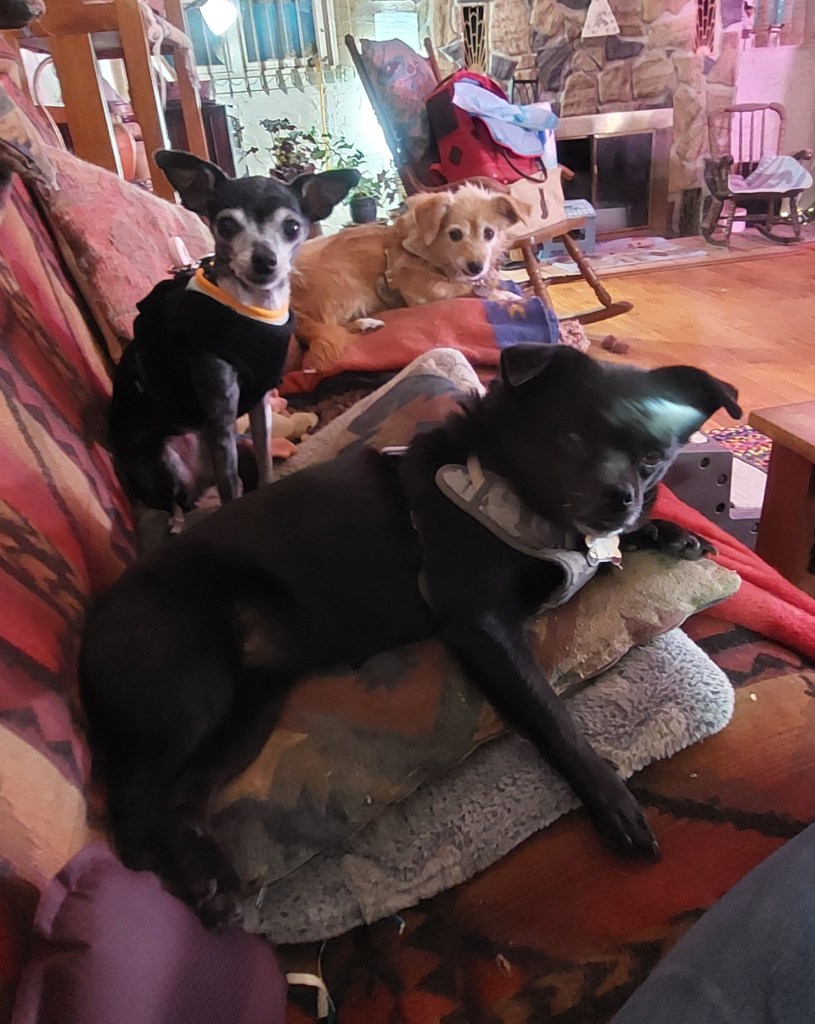 Now the terrain is more familiar. This was the road we took to get Kokopelli’s surgery at Roaring Fork Vet Surgery last spring. You see, Highway 50 is still under construction or we wouldn’t be on I-70 at all! Highway 50 is much quicker and more scenic. But, we are making progress. Cimarron had a meltdown having to pee near Delta – so we did have one more pit stop. We got home by evening and started the journey of getting Cimarron settled into the pack.