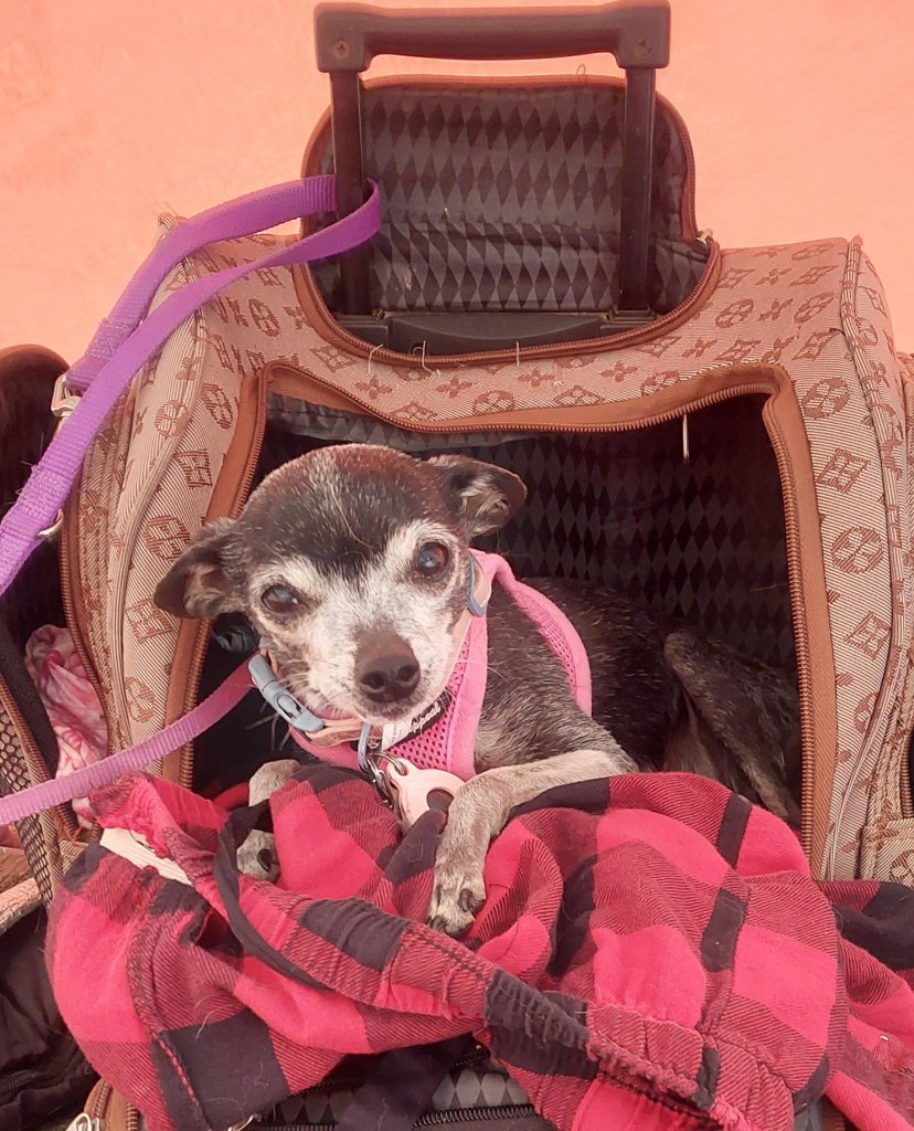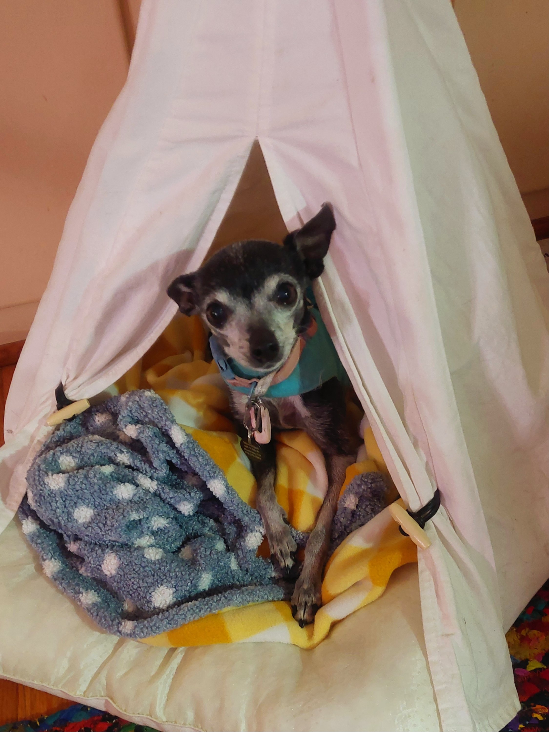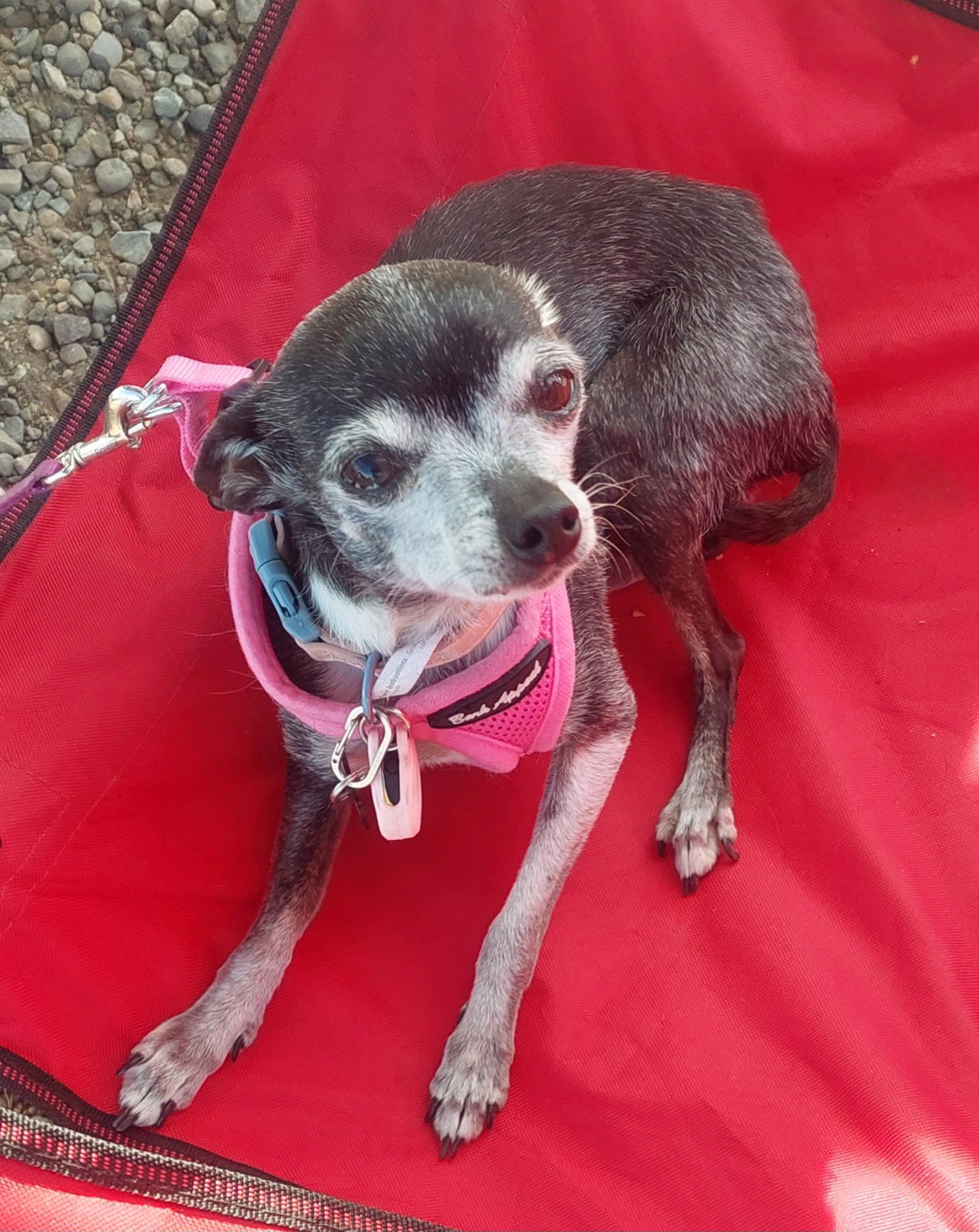 I rescued Cimarron from Harley’s House of Dreams, the same rescue Kokopelli came from in April. I have been longing for another tiny dog since Sazi passed. I guess my feng shui was lined up right, because Cimarron (formerly Simone) became available at just the right time. We were planning a camping roadtrip in a few weeks and could pick her up on the way home.