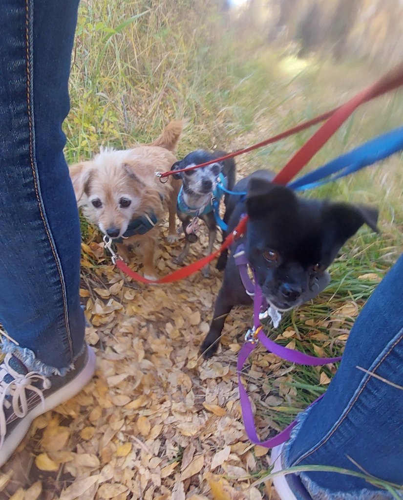 I talked with Cimarron’s former family to find our more about her because she has fear-aggression as a reaction to some types of touch (harness and sweater area). They said she was like that when they rescued her and that she had become much more social during her time with them. They said she acted very skiddish and perhaps was even abused in her past life.