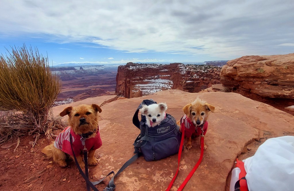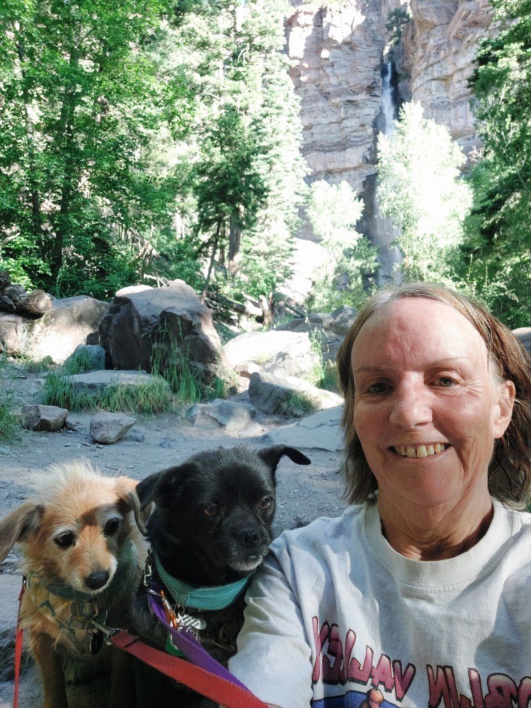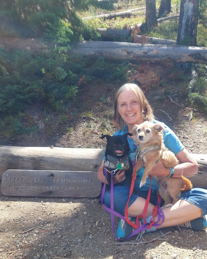 In August, we set off on an 11-day camping road trip. We spent a few days in the Dinosaur National Monument/Flaming Gorge area (Kachina, Koko, and me) area. Then, on to Pearl Lake State Park (Grandma’s Lake) for a few days. Then, we shifted course to the Front Range to pick up another senior rescue dog from Harley’s. This sweet chi mix girl is thought to be part Italian Greyhound and she spent her first night with us in a tent – then we packed up and headed home. Her name was Simone but she is now Cimarron Esti. (She is from my childhood hometown of Estes Park.)