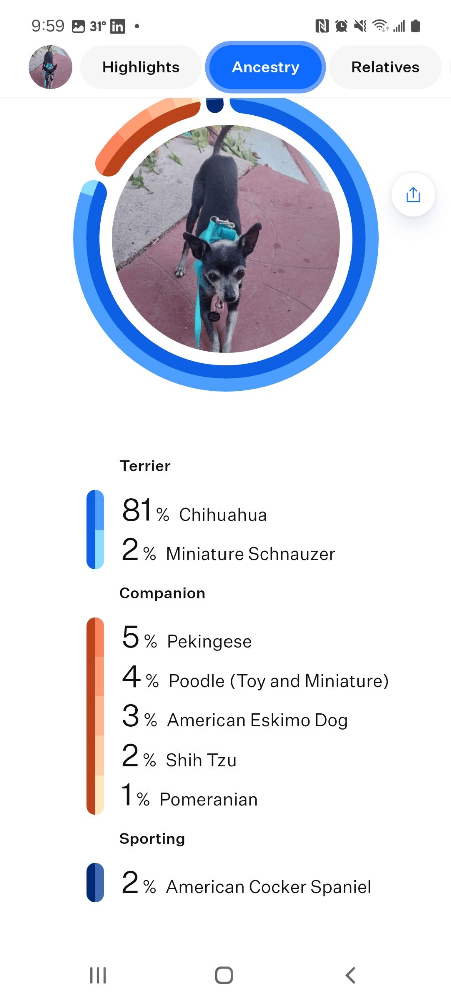 We got the Embark results earlier this week. The results were markedly different. Both have chi as primary, but a 30% difference! Wisdom Panel found 5 sub-breeds not identified by Embark. Embark found 2 sub-breeds not identified by Wisdom Panel. Still no Italian Greyhound, but Embark did find Rat Terrier as the secondary breed. Apparently, some Rat Terrier lines descend from Italian Greyhounds or Whippets. She obviously carries a strong phenotype that suggests sight hound ancestors. Because they were bred into Rat Terriers many years ago, it would not show up as a separate breed.