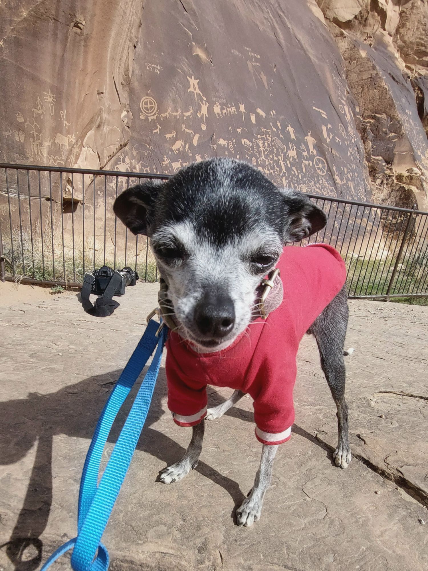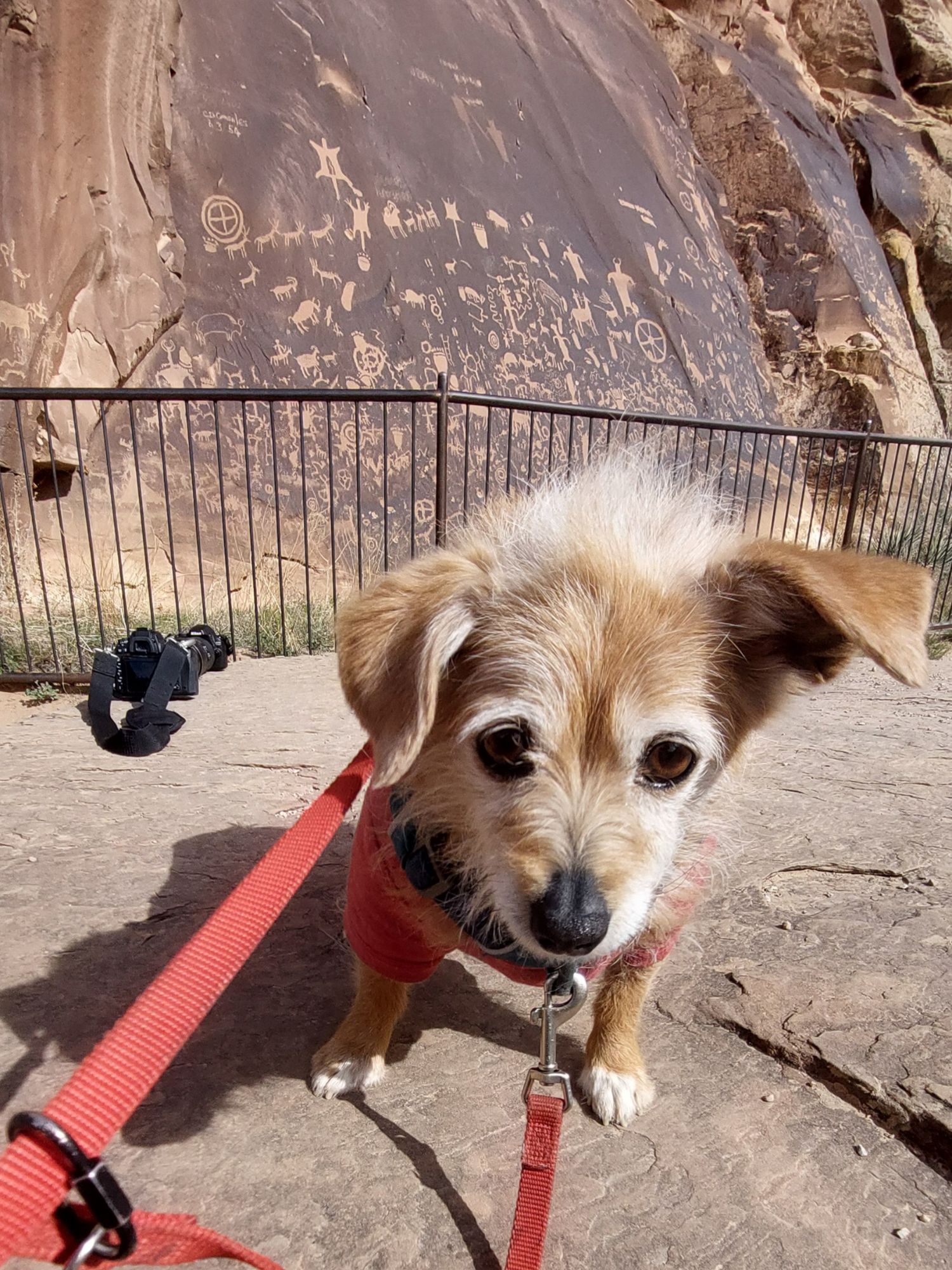 It’s a super short walk from the 12 mile drive once you turn off the highway. If you drive further, you are at Canyonlands. It’s fun but I always wish the hike was a little longer. It’s a beautiful panel and a fun place to pose the dogs.
