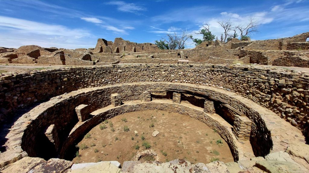 Today took us from Mesa Verde National Park in Colorado to another amazing Ancient Pueblo Ruin – Aztec Ruins in New Mexico. These are grand ruins – I can see why they originally thought the structures were Aztec. Aztec an outlier of Chaco Canyon further to the south. Chaco Canyon was a spectacular cultural center that holds the same kind of mystic as other ancient cultures.