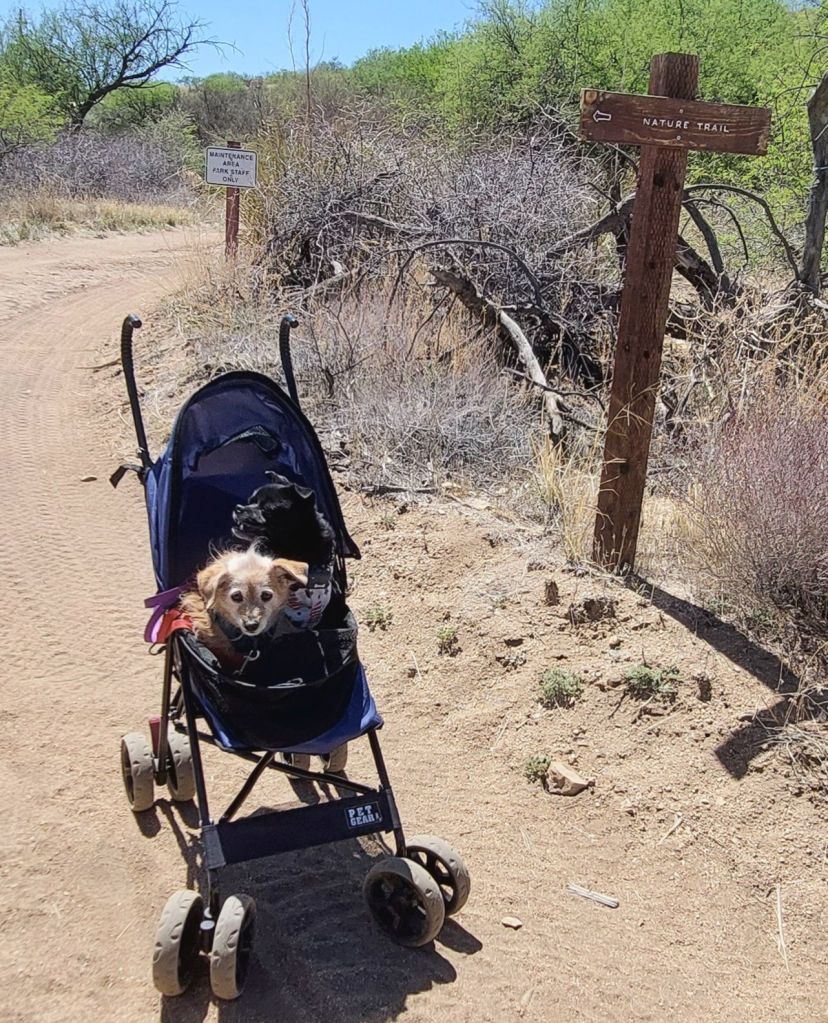 What is nice about Oracle State Park is that it’s about 10 degrees cooler than Tucson. And, it’s too hot to hike by the time we arrive, but too early to check into the hotel. They have a lot of trails and there is lots of Catalina Mountains foothills foliage. Because it’s foothills, it’s rocky hiking. Fine for feet, rough for dog strollers. We don’t go very far because I’m afraid I’ll pop a wheel. I should add that it’s hot enough that my senior girls can’t hike super far.