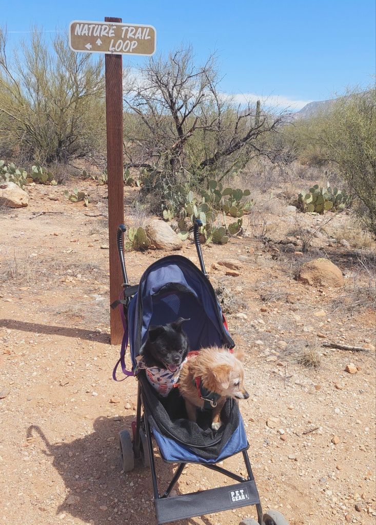 Two years ago, I put Koko in the backpack because of her heart. I didn’t have Cimarron yet. Koko hated the pack because she got hot. Last year, with the addition of Cimarron, we started doing the Nature Trail in a stroller with Cimarron in a carrier. It’s an OK Trail and really the only option other than packing both Koko and Cimarron plus water. And, Kachina is 11 now, too.