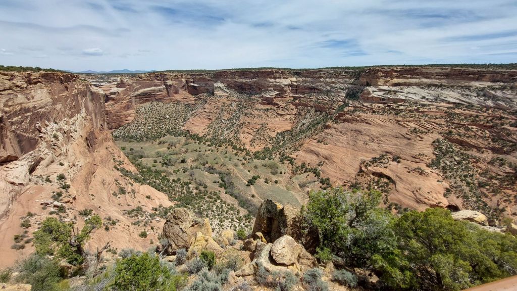 We took AZ 64 from Tsaile to the north rim turn-outs. The first turn-off is for Massacre Cave and Mummy Cave. It’s the same turn-off, but splits about a mile from 64. I believe this is about 16 miles from Tsaile. With of the overlooks have parking and short walks to the overlooks.