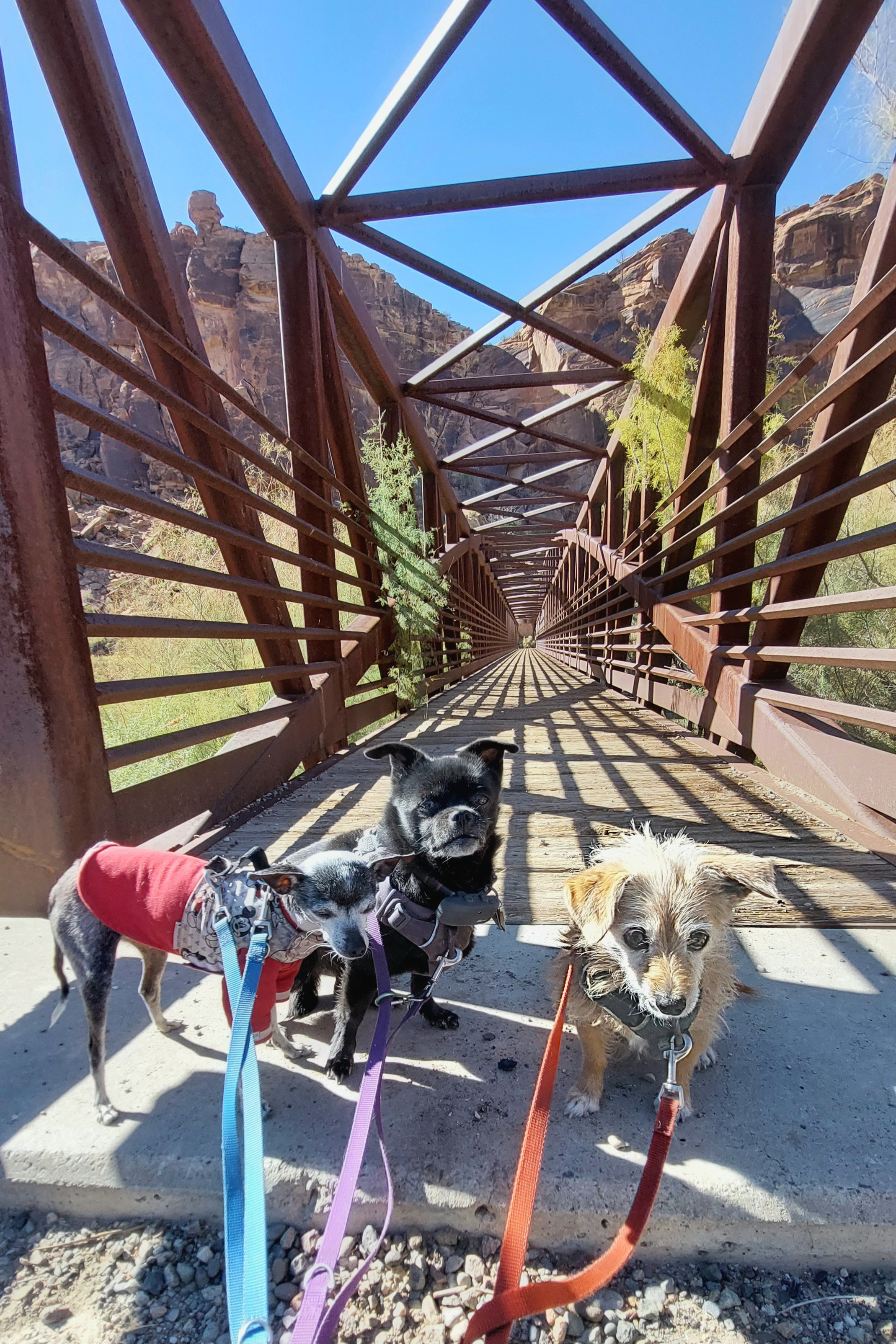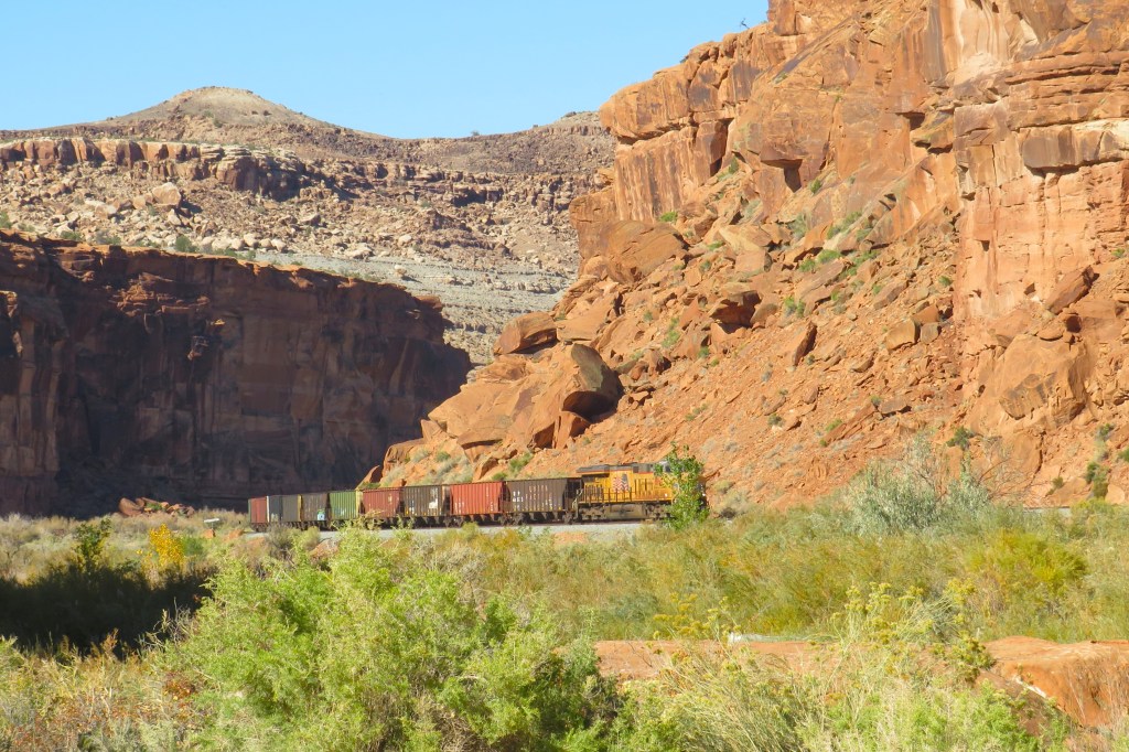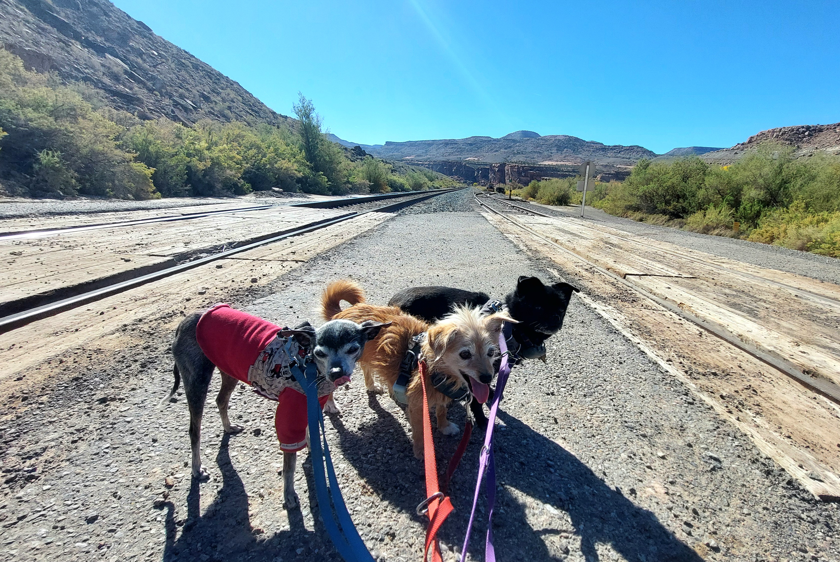 That said, the fall hikes are my favorite because of the gorgeous fall leaves. The red canyon walls, green-tinged Gunnison River (I call in the Leprechaun River in March), yellow rabbit brush, golden grasses, and the bright orange leaves don’t disappoint. We also got to see the train come through the canyon – always a treat unless you are early in the hike and close to the tracks. Then it can upset the dogs.