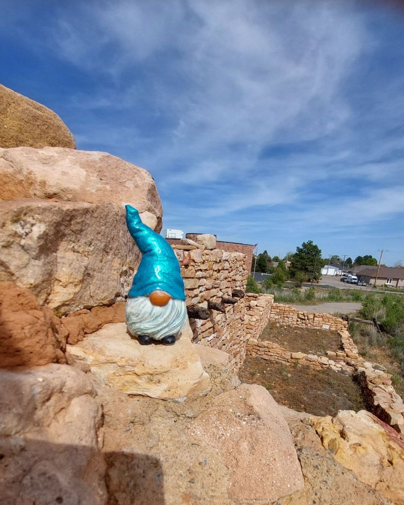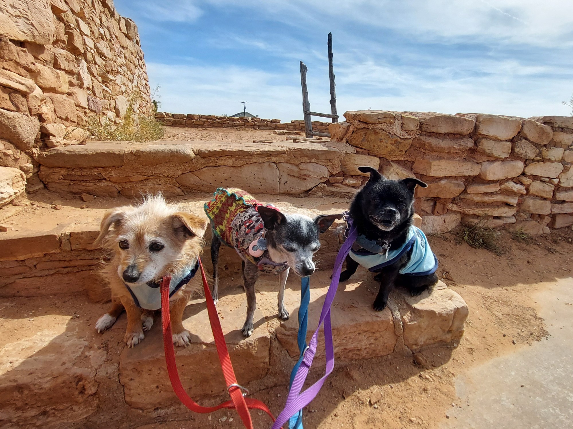 In addition to my pack of beloved senior rescue dogs, I’m toting a couple of my travel guardian gnomes. My roadtrip guardian gnome, Twinkle, got to accompany Kachina, Cimarron and Koko of our photoshoot of the Pueblo.