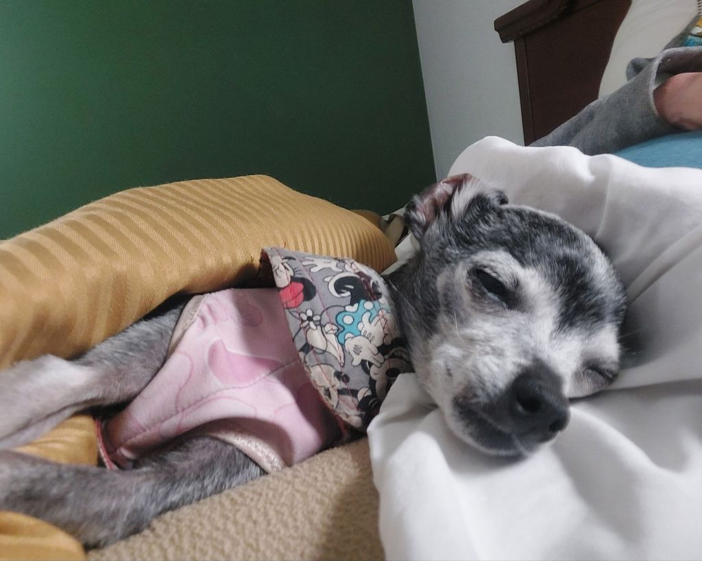 After the walk, Cimarron finally slept as I drove another 100 miles. She is still lame, but very much acting like herself otherwise. She gobbled dinner and guzzled water. She sleeps peaceful. I talked to her vet and carry emergency anti-inflammatory meds for her that she took.