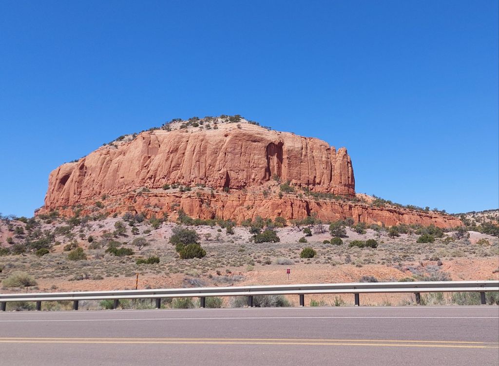 The red fades to more traditional sandstone color as you drive further north to Crownpoint and over the Continental Divide. Then things mostly flatten to sage and grass with some buttes.